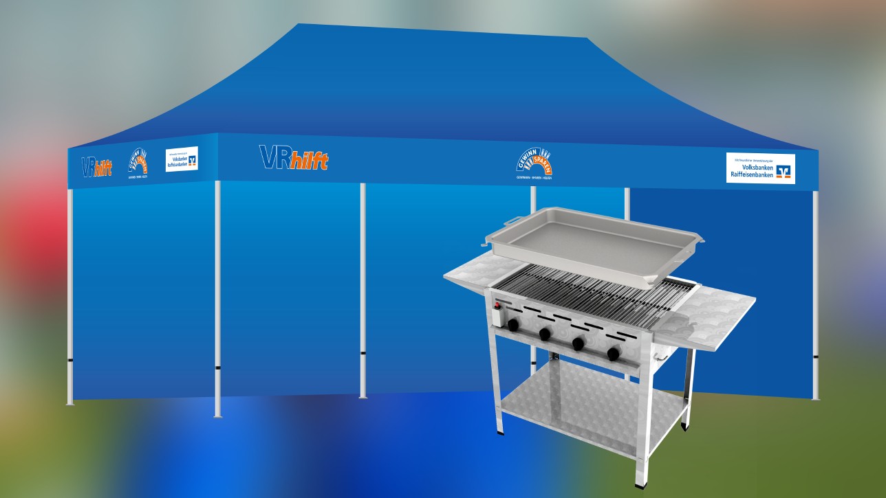 Das Profi-Faltzelt, mit VRhilft und Gewinnspar-Logo, für viele Einsatzmöglichkeiten. Ob für Sport-, Kindergarten- oder Promotion-Veranstaltungen. Geeignet für Indoor und Outdoor.